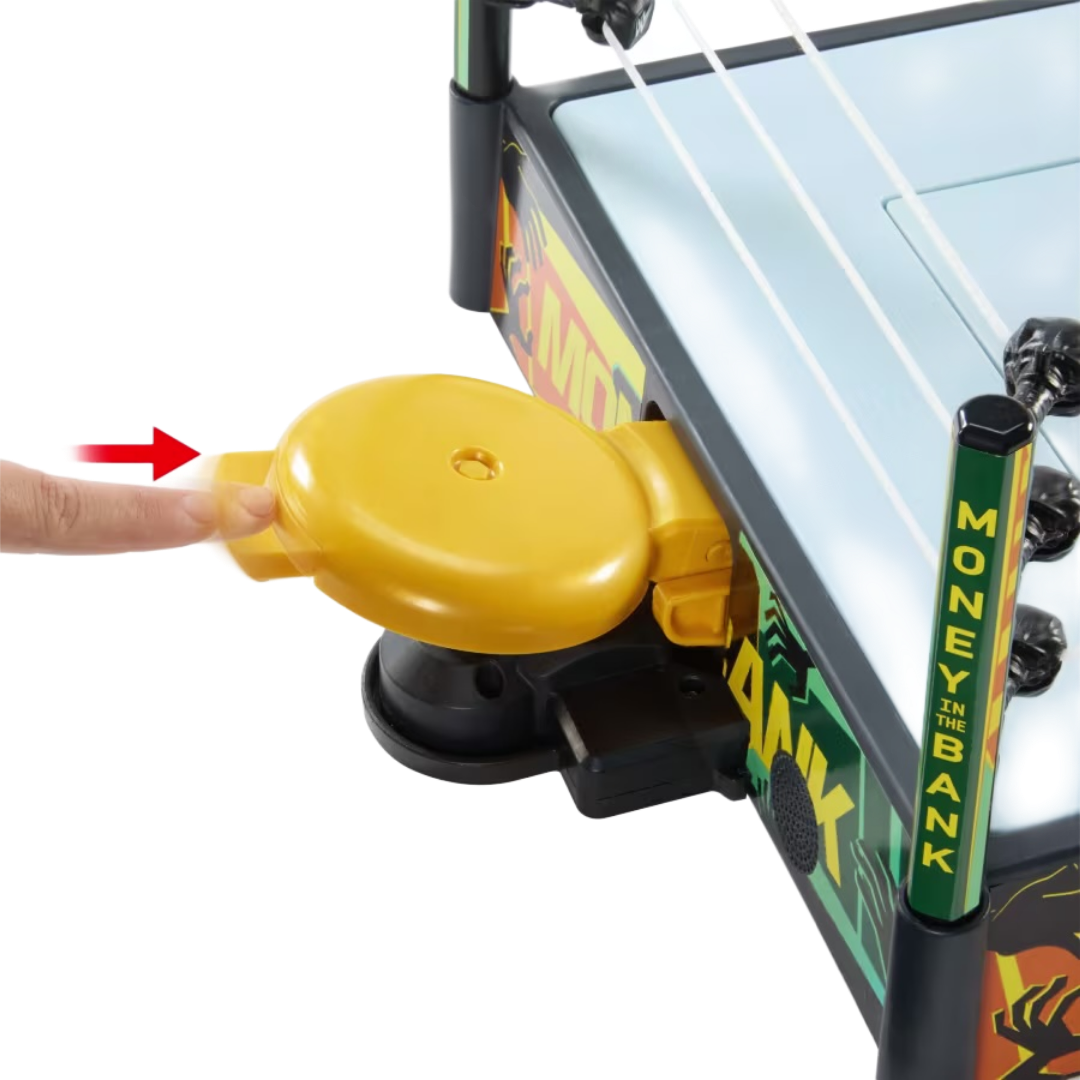 - Modo Money in the Bank: Envía a tus figuras de acción de la WWE (se venden por separado) volando hacia el maletín suspendido o fuera del ring, ¡tal como en un combate real!